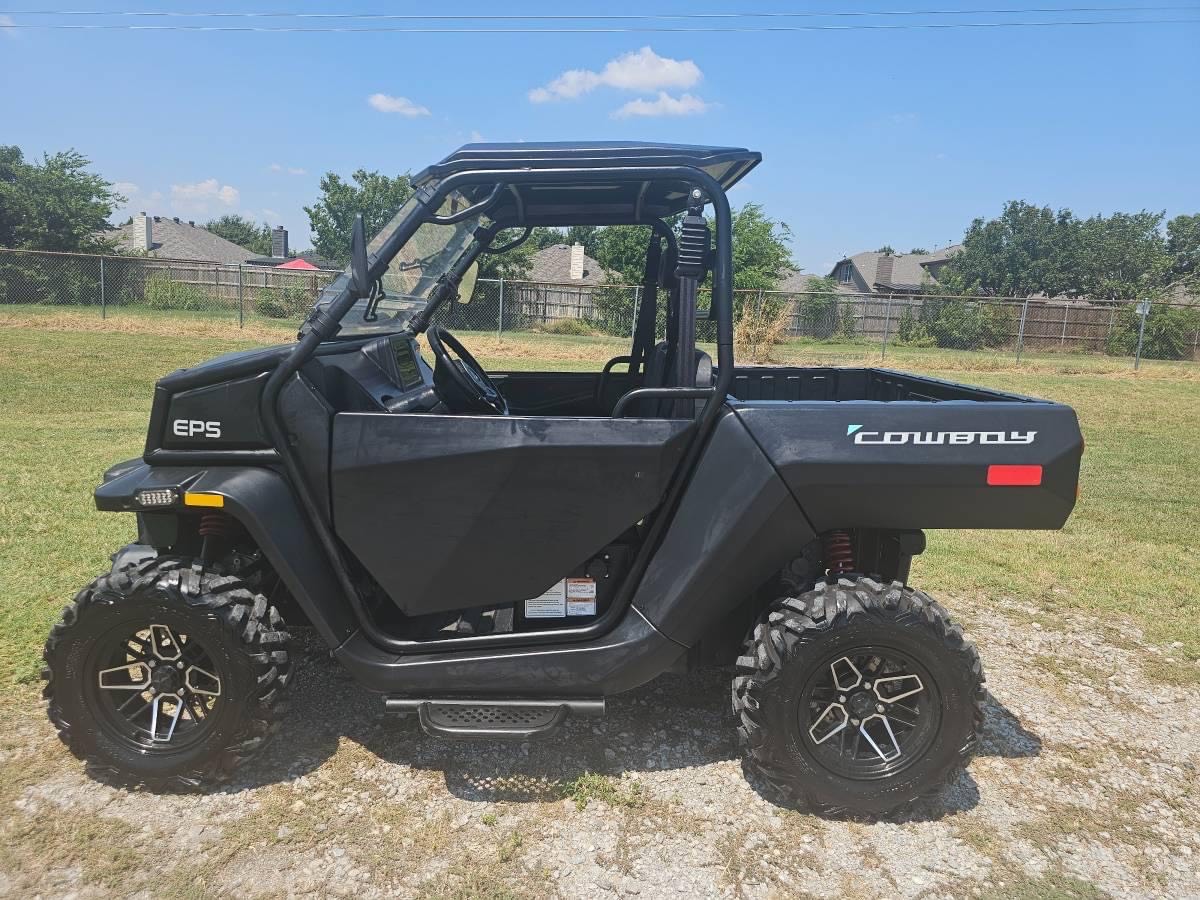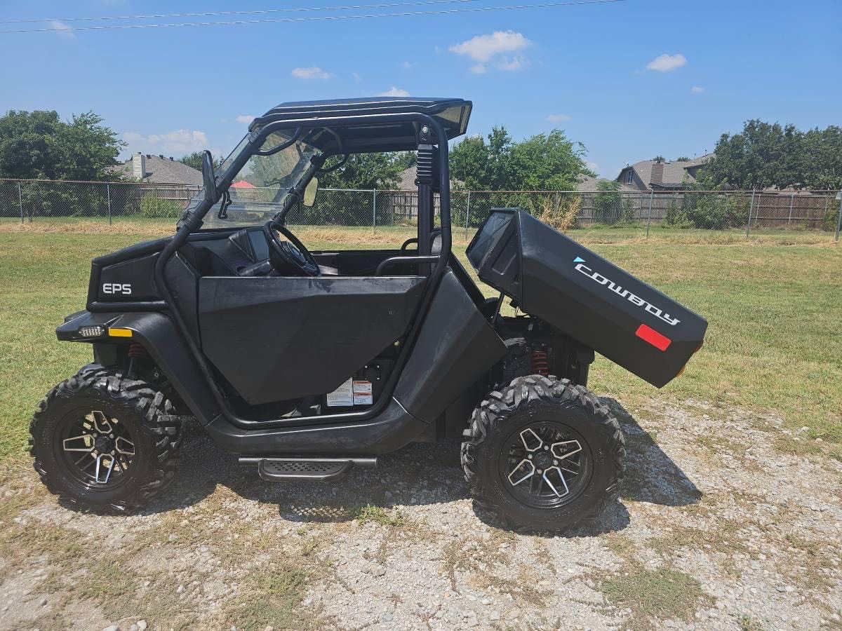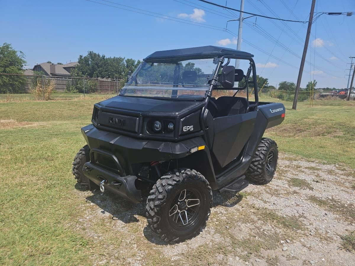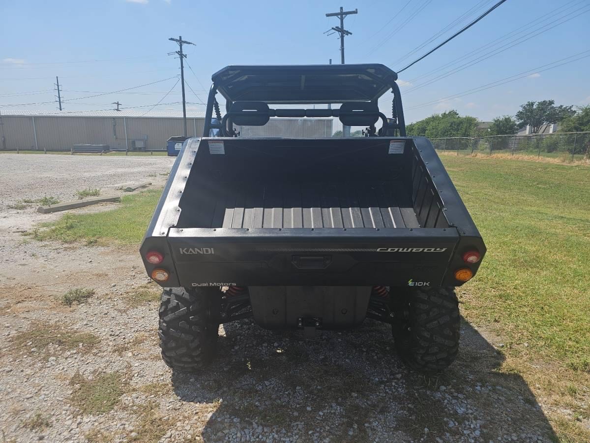 Lithium 2024 Kandi Cowboy e10K UTV 72v   Lithium 72v Zero Maintenance Batteries!! 10″ Touch Screen and Back up Camera On Board Charger Up to 40MPH All-Wheel Drive system Electric Power Cargo Bed up to 1250 lbs 2″ Hitch, towing capacity up to 2500 lbs Independent Double A-Arm, front and rear Brakes front and rear disc Electric Power Steering Side Doors Cool Flow Windshield 14″ Aluminum Wheels 26″ All Terrain Tires Black Matte Finish Has a slight pull .$4,985